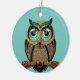 If you love owls and history, you'll find them both in this beaded owl. An intricately detailed design of metallic beads (note: this is a printed image) in 1920s and 1930s art deco styling. Turquoise details stand out from the gold, silver and black of the motif, and the bird perches on an embroidered-look branch. You can personalize with your own text on the back if you have chosen the double-sided ornament. It's also possible to change the background color but the pale teal default shade is recommended for this owl image.