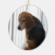 This portrait is a photo of a senior beagle making a silly, cute beagle face.