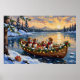 Bring cheerful, lovable charm to your holiday season with this adorable Beagle Christmas design! This magical scene features three happy, expressive-eyed Beagles sitting contentedly in a cozy wooden boat, gently floating on a serene snowy lake at sunset. The boat is beautifully adorned with glowing Christmas string lights and fragrant pine garlands, while the dogs wear festive scarves. They are surrounded by colorful wrapped presents and cheerful holly branches. Soft snowflakes gently fall, and the shimmering reflection of the lights on the water creates a truly magical winter holiday atmosphere. This design is a perfect Christmas gift for any Beagle owner, dog lover, or admirer of festive and beloved scent hound art, capturing the serene joy of the season.