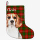 Watercolor illustration of Beagle dog on green and red plaid background. Personalize with name or special message