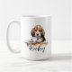 A morning coffee mug with a puppy beagle with custom name in script style. "May your Coffee be stronger than your dog's Attitude" is written on the back. Perfect gift for dog owners that have a dog with an attitude and also love coffee.