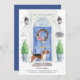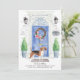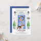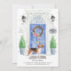 Announce your new address with our stylish announcement featuring a Beagle, blue front door, welcome mat, slate sign, topiaries and a floral wreath set on a gray brick background.