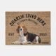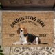 Beagle Personalized Dog lover welcome doormat. This welcome mat can be personalized with your dog’s name, the slogan can also be changed or you could use a picture of your own dog (make sure it's transparent). Text reads: Charlie lives here…. All treats welcome