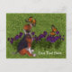 Cute beagle puppy with butterflies, purple flowers, and blue skies painting customizable postcard. Replace your text in the template, or be sure to delete for plain card. Click on Customize to change font size, style, and color, and to add text. Great for save the date and new address announcements. If you need help or have any requests, please contact me. This image is available on many products in my gallery.