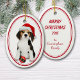 On the front of this Christmas ornament is an image of an adorable black and tan Beagle puppy wearing a red and white Santa hat. The puppy has found a Holiday tree bulb that looks like a Santa Claus suit, and is ready to play. The image is placed on a white background with a red double lined oval frame. The back of the ornament has the same border frame with your custom text contained in several fields.