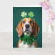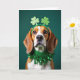 This card features a sweet beagle facing forward with a calm, trusting look that feels like a quiet hello from a close friend 💚. Its tri-color coat—warm brown, crisp white, and deep black—stands out against a rich emerald green background that suggests an Irish hillside. A bright green headband sits on its head, topped with two glittery shamrocks that catch the light ☘️. Around its neck is a tinsel-like emerald collar that adds soft sparkle and a party-ready texture. Gentle, diffused lighting smooths over the floppy ears and highlights tiny whiskers along the muzzle, giving the portrait a tender, affectionate mood. The beagle’s large amber eyes shine with mild curiosity, as if it’s holding your gaze for one more second. The greeting text appears near the top in light gold lettering, balanced above the dog’s headband against the green backdrop. Small flecks of glitter on the shamrocks and a softly glowing green background frame the dog at the center.