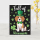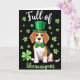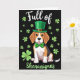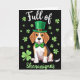 This card features a cartoon-style beagle centered on a deep black background, looking straight ahead with a sweet, curious gaze that feels like it’s meant for a close friend or someone you adore 💚. The pup’s warm tan-and-white fur stands out against the dark setting, and its gentle expression reads like a quiet invitation to share a laugh together. It wears a bright green leprechaun top hat with a shiny gold buckle, plus a matching bow tie covered in small shamrocks for a festive touch ☘️. A scatter of glowing green shamrocks in different sizes floats around the dog, giving the scene a light, drifting motion without crowding the main figure. The words “Full of” appear above the beagle in green lettering, while “Shenanigans” sits below in matching green, framing the character from top to bottom. The text placement keeps the dog as the focal point, while the greens echo the hat and bow tie to tie the layout together. Soft, rounded edges on the illustration and the shamrock shapes add an easy, friendly look, with the gold buckle catching the eye near the top of the design. The final view is a centered beagle under “Full of” and above “Shenanigans,” surrounded by floating green shamrocks on a black field.
