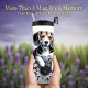 A cheerful Beagle with its distinct tri-color markings and a happy, open-mouthed expression is delightfully posed amidst a serene arrangement of grayscale sunflowers and various subtle purple and pink blossoms. A lone butterfly adds a touch of simple beauty to this artistic floral portrait.
