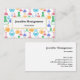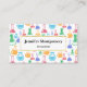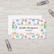 Business cards with a fun and colorful pattern. Research scientist vibe with beakers and flasks of different shapes and sizes in bright happy colors.