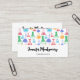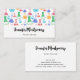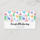 Business cards with a fun and colorful pattern. Research scientist vibe with beakers and flasks of different shapes and sizes in bright happy colors.