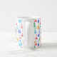 A mug with a fun and colorful pattern. Research scientist vibe with beakers and flasks of different shapes and sizes in bright happy colors.