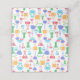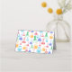 Folded place cards with a fun and colorful pattern. Research scientist vibe with beakers and flasks of different shapes and sizes in bright happy colors.