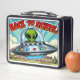 Forget the school bus, this alien student prefers a more intergalactic mode of transportation! This playful image features a classic UFO hovering above a school, with a friendly alien passenger ready to start the day. The comic book aesthetic and bold colors make it a fun and eye-catching design, perfect for celebrating back-to-school season. It's a reminder that learning can be an exciting journey, no matter how you get there!