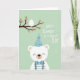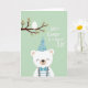 This card features a stylized white bear at the center, eyes gently closed in a content smile that feels like a quiet hug from a close friend. The bear wears a blue checkered party hat, a matching bow tie, and striped overalls held by dark suspenders, adding a sweet, dressed-up touch. Near the top, a brown branch curves in from the upper left with small golden buds, like early spring arriving 🌷. A single smooth white egg rests on the branch, placed near the upper middle, echoing the bear’s soft, rounded shape in a way that feels tender and connected. The background is a muted mint green, keeping the scene calm and airy while letting the white bear and egg stand out. Short greeting text sits prominently near the top in a rounded font, set in a dark tone that reads clearly against the pale background. The gentle pastels and simple shapes create an affectionate, close-knit mood, like two companions sharing a quiet moment together 🐇. The branch stretches diagonally across the upper area with golden buds spaced along it and the egg perched neatly near its center.