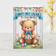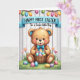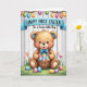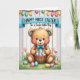 This card shows a chubby, cuddly cartoon bear in warm brown tones, sitting on a rounded patch of rich green grass with tiny white and yellow flowers, holding a woven basket close like it’s sharing a sweet moment with you 🌷. A sky-blue bow tie sits at its neck, echoing the light blue inside its ears, and the bear’s gentle tilt and soft gaze add a friendly, affectionate touch. The basket is filled with decorated eggs in pink, yellow, blue, and purple, and a few rest near its feet with stripes, dots, and small flower patterns 🐰. Across the upper area, a long blue ribbon banner stretches horizontally with celebratory wording printed in a lighter tone that stands out against the ribbon. Behind everything is a lightly worn white plank wall that gives the scene a cozy, rustic setting without stealing focus from the bear. Along the top edge, a hanging garland of patterned egg shapes adds extra color and a sense of togetherness, like decorations put up for someone special. Soft lighting highlights the bear’s rounded cheeks, the basket weave, and the scattered eggs against the pale wooden background.