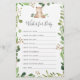 Bear themed baby shower wishes for baby game card features a watercolor bear illustration and watercolor greenery eucalyptus garland and elegant handwritten style font.