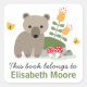 Cute and fun bookplate stickers / book labels for kids featuring a little cartoon bear cub standing next to a rock with flowers in the background. In the foreground are red and white toadstool mushrooms and around the little bear flutters yellow butterflies. Customizable text "this book belongs to". Personalize the name. Cute design for children, ideal for labelling school books and other books.