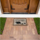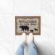 This is a cute door mat which is perfect for a cabin or woodland home. It features a faux wood grain banner with a black mama bear and two cubs. The text above the bear images says "Welcome to our Den". The banner is placed on a solid medium brown background.