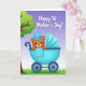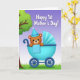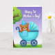 This card features a cute, bear-like character in warm brown with big expressive eyes, rosy cheeks, and a gentle smile that feels like a loving glance ❤️. A striped cone party hat in cheerful blue tones with a small white pom-pom sits on its head, adding a festive touch. The character rests in a stylized baby carriage colored bright aqua blue, with rounded sides, a fanned canopy, and dark blue spoked wheels that give it a classic look. A light blue blanket with small polka dots drapes over the carriage, making the scene feel cozy and close, like a quiet moment shared between family. On the left, a tree trunk and leafy green branches frame the scene, while fresh green grass stretches along the bottom. Behind everything, the sky fades from soft lavender at the top into pale blue, creating a gentle glow 🌼. Across the upper area, the words “Happy 1st Mother’s Day!” appear in large white lettering, centered and easy to spot against the sky. The carriage’s canopy is scalloped and shaded in soft blues, with the wheels placed low and slightly angled beneath the rounded body.
