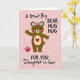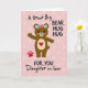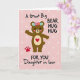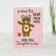 This card features a friendly, bear-like character in warm brown tones, standing front and center with one arm reaching out as if offering a gentle hug ❤️. A ring of small flowers in blue, purple, and pink rests on its head, adding a soft, caring touch that feels like a sweet gesture between close family. The bear’s dark eyes and rosy cheeks give it a tender, affectionate look, as though it’s gazing warmly at someone just off the page. On its chest, a bright red heart sits on a creamy white patch, drawing attention like a simple symbol of closeness. Near the lower left, a red paw print adds a small accent that echoes the hug theme without crowding the scene 🌼. The message is arranged around the character in thick, hand-drawn lettering, with “A Great Big” and “FOR YOU” in red, “BEAR HUG HUG” emphasized in larger letters, and “Daughter in law” placed beneath in a smaller line. Behind everything, the background is light pink with a faint, soft-edged polka-dot pattern spread evenly across the card.