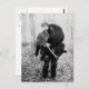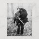 Old photo of hunter in the woods with gun carrying a bear, early 1900s.