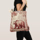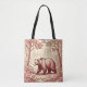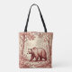 A vintage looking toile de jouy image of a bear wandering through a forest, in vivid red-browns on a tan background, makes this tote bag perfect for anyone who loves animals, wildlife, nature, and the outdoors.