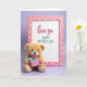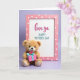 This card shows a vertical scene washed in a soft glow, centered on a chubby light-brown plush bear-like creature sitting forward with a gentle smile and a tiny tongue showing, as if sharing a sweet moment ❤️. It hugs a small pink gift box close to its chest, and the smooth aqua ribbon tied around it catches the light like a careful finishing touch. A fluffy pink flower sits on top of the box, adding a romantic, thoughtful accent to the little offering. Behind the character, slightly off-center, a rectangular sign with a pink border and evenly spaced white polka dots frames the message like a keepsake. Inside the white center, “love ya” appears near the top in deep pink lettering, with “HAPPY MOTHER’S DAY” placed below in teal, both centered and easy to read 🌼. The bear’s relaxed posture and the close hold on the gift suggest warm closeness, like a quiet hug captured in a picture. Everything sits on a pale lavender surface that continues into the background, with diffused light softening the edges of the plush fur and the ribbon’s sheen. The pink polka-dot border stands out crisply against the white panel and lavender backdrop.