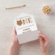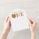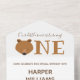 Our little bear is turning one first baby birthday invitation with a photo template. This invitation is brown and white with the word "One" in large letters with a bear face illustration as the first letter of the word. The invitation folds and the photo can be separated and kept by the recipient. Simply customize this invitation with your photo & information, add it to your cart, and happy birthday to your wonderful baby!
