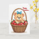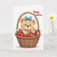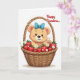 This card shows a friendly light-brown bear with rounded features, shiny black eyes, and a gentle smile peeking out of a rustic woven basket, as if offering a sweet treat to someone close ❤️. A sky-blue bow sits on the bear’s head, adding a soft touch that makes the bear look extra caring. The basket is filled with plump, glossy red strawberries topped with fresh green caps, arranged like a thoughtful gift. Small white daisies with sunny yellow centers are tucked among the fruit, giving the scene a fresh, garden-picked feel 🌼. Everything sits on a bright white background, so the reds, greens, and blues stand out clearly without distractions. A short message appears in rich crimson lettering near the upper right, leaving plenty of open space around the illustration. Light shading beneath the basket adds depth, and the bear’s tender, inviting expression draws your eye toward the strawberries and flowers. The final touch is the subtle shadow cast just under the basket’s base on the white backdrop.