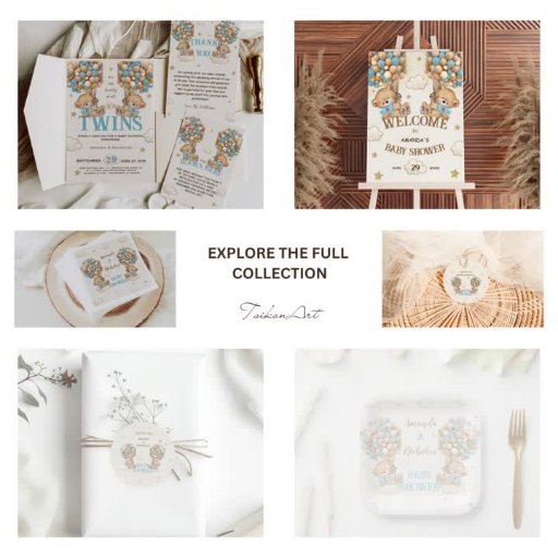 Teddy Bear themed Twin boys Baby Shower thank you card, featuring the sweetest bears soaring high with cute hot air balloons! This design is perfect for celebrating the arrival of twin boys. Cute teddy bears with blue bows are holding blue and beige balloons. 💙 💙 Don't forget to explore the full collection!