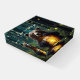Big black bear in a dark forest with a glass jar filled with fireflies and an inspirational quote.