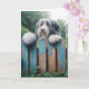A fluffy Bearded Collie dog with black and white fur peers over a weathered picket fence with chipped blue paint