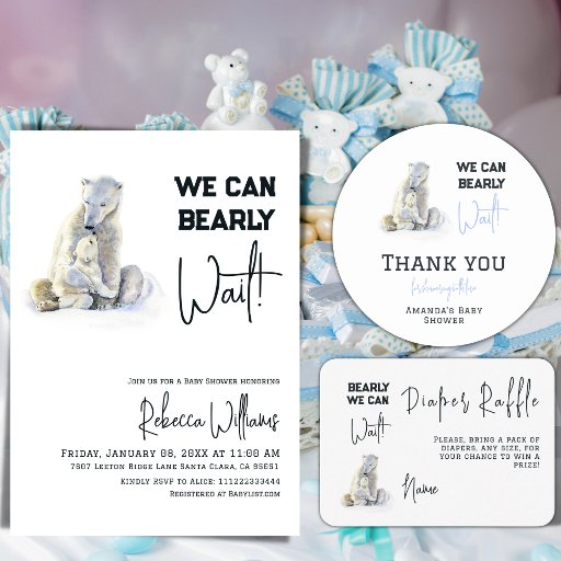 Watercolor Polar Bear Mommy with little bear and all bear family together in the back side and calligraphy script phrase "We can Bearly Wait!" in white and black colors. Great theme ideas for the Gender Neutral Baby Shower Party. Easy to personalize with your text. Matching items and other winter baby shower decor with this design you can find at Polar Bear collection in my shop PatternDigitPics. If you have some special request, feel free to send me e-mail to: t.dyomushkina@gmail.com