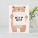Welcome your little girl with this adorable baby shower invitation featuring a sweet bear illustration holding a sign that says “It’s a Girl.” The reverse side includes event details with a soft pink background and playful bear-themed heading. Perfect for woodland or animal-themed baby showers with a feminine touch!