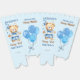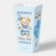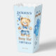 Beary first boys birthday party tableware personalized popcorn favor box, watercolor cute teddy bear dressed up in pant and a bow tie holding a blue balloon party favors blue brown and white color theme teddy bear popcorn favor box.