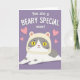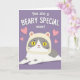 This card shows a simple digital illustration of a cute cartoon cat with soft white-and-gray fur, wearing a cream hooded outfit shaped like a little bear with rounded ears. The cat is stretched calmly along the bottom of the design, gazing upward with large golden eyes that feel tender and affectionate, like it’s sharing a quiet moment with someone it trusts ❤️. Its tiny pink nose and small smile add to the gentle, friendly mood without needing extra details. The background is a smooth field of soft lavender, giving the scene a calm, cozy setting. Near the top, the message “You are a BEARY SPECIAL mom!” is placed in thick white lettering, standing out clearly against the purple. A few pink hearts float around the upper area, adding a sweet, caring touch 🌼. The bear-hood ears are rounded and light cream, and the hearts vary in size across the lavender space.