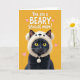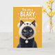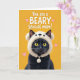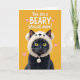 This design shows a sleek dark-furred cat sitting against a golden-yellow background, filling most of the lower two-thirds of the card. Its glossy coat contrasts sharply with the bright setting, while amber eyes look forward with a gentle, slightly bashful gaze that feels affectionate ❤️. The cat wears a cream-colored plush hood shaped like a rounded-eared woodland animal, with tiny simple facial marks and a drawstring that ends in a soft pom-pom. The cozy headwear adds a cuddly touch, like a quiet nuzzle between close family members. Across the upper third, white uppercase text reads “You are a BEARY Special mom!” with the word “BEARY” emphasized in the same white lettering for a clear pun. Small soft-pink hearts float around the message, adding a sweet, friendly sparkle 🌼. The fur is shaded with fine texture, and the hood looks fluffy with light cream highlights and a dangling pom-pom near one cheek.