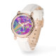 An elegant rose gold watch with a beautiful red, blue and pink liquified abstract design. This pretty watch comes with an elegant white leather wristband. The watch face has a text message. Text and photos are customizable, and can be easily personalized to fit your needs. This unique and beautiful watch is the best gift for your wife, girlfriend and mom. Great gift for birthday, wedding, anniversary, holiday, Valentine’s Day, Mother’s Day , and for yourself!