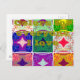 This artwork features a grid-like pattern of nine squares, each containing a unique variation of a central star-like or floral motif set against a checkered or geometric background. The composition is symmetrical and visually busy, emphasizing the intricate patterns and variety within each square.