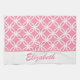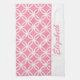 A beautiful and pink kitchen towel, this item features a pink and white circular pattern as the background. There is a place to customize your name.
