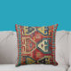 This handsome design, taken from a fragment of a hand woven flat weave rug, has a wonderful geometric pattern. The original antique Kilim style fragment is approximately 150 years old. The colors are rose red, midnight, navy, royal, turquoise blue, camel, and creamy white. This is an ancient tribal design that is still stylish today and will be for many more years to come. Classic never goes out of style.
