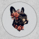 Grace meets grit in this striking illustration of a French Bulldog adorned with intricate floral elements. With soft roses blooming against the bold lines of its strong features, this piece celebrates contrast — strength and softness, elegance and attitude. The black-and-rose palette adds a vintage tattoo flair, while the soulful gaze of the Frenchie holds both curiosity and quiet wisdom.