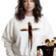 Celebrate the reason for the season with this powerful and artistic sweatshirt. The design features a cross rendered in a rustic, textured brush stroke style, with a serene sunset and landscape visible through the center. It's a beautiful and reverent way to remember the spiritual heart of Christmas. You can customize the shirt to add your Christmas wish or the name of your loved ones.