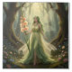 A beautiful fairy wearing a flowing light green dress and jewelry made of peridots with peridot stones in her long light green hair and translucent dragonfly-like wings holding a gladiolus walks in a magical forest surrounded by pink and blue flowers and vine-covered trees.