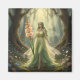 A beautiful fairy wearing a flowing light green dress and jewelry made of peridots with peridot stones in her long light green hair and translucent dragonfly-like wings holding a gladiolus walks in a magical forest surrounded by pink and blue flowers and vine-covered trees.
