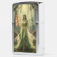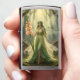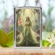 A beautiful fairy wearing a flowing light green dress and jewelry made of peridots with peridot stones in her long light green hair and translucent dragonfly-like wings holding a gladiolus walks in a magical forest surrounded by pink and blue flowers and vine-covered trees.