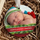 Cute Photo Baby's 1st Christmas Ornament featuring a red ribbon adorned with green evergreen's and white lace. Just add YOUR PHOTO and babys info on the matching back! Perfect for first christmas & second christmas. A Wonder Christmas gift sure to be treasured for many years to come. © JW Illustrations