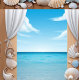 A digital painting shows a beach scene framed by seashells and white curtains. The view is of a bright blue ocean under a clear sky with scattered white clouds. The water transitions from a deep blue at the horizon to a lighter, turquoise near the shore, where gentle waves create a foamy edge. The frame of the image is composed of light brown wooden planks on either side, adorned with various seashells in shades of white, cream, and light blue. The seashells are arranged in a decorative pattern, adding a nautical theme to the composition. Hanging from the top of the wooden planks are white curtains, tied back with simple knots, which add a soft, elegant touch to the scene. The overall style is reminiscent of a travel poster or a decorative piece, with a focus on bright, inviting colors and a clean, stylized aesthetic. The lighting is soft and diffused, enhancing the tranquil and inviting atmosphere of the beach scene.