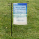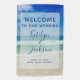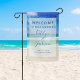 This beautiful beach wedding welcome garden flag sign features a gorgeous photo of the ocean waves for a destination wedding. Pretty beach photography paired with elegant white and blue typography creates a chic, modern look for a tropical island event. Welcome to Our Wedding signage.