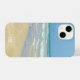 Beautiful beach monogram iPhone 14 case with gorgeous seaside photography featuring a pretty sandpiper standing at the edge of the ocean waves on a sunny summer day. Lovely blue green water waves roll onto the sandy shore where your custom text is personalized in lovely white cursive typography. A beautiful island gift.